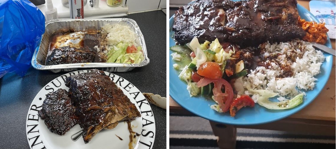 Wow wow wow. We’ve just had the best tasting ribs ever. The meat fell off the bone, was juicy and succulent and portion size was great. We ordered large ribs with salad and rice & peas. Great value for money. Lovely couple. Can’t wait to order again. Highly recommended.